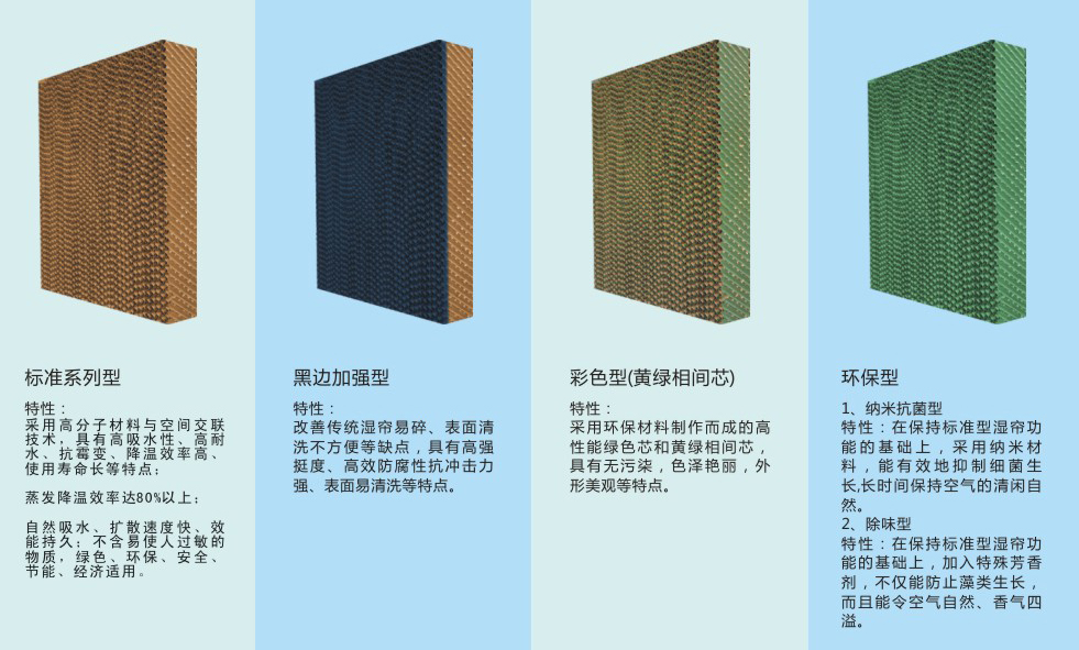 綠色濕簾型號:5060/5090/7060/7090 優質濕簾還不含易使皮膚過敏的苯酚等化學物質,安裝使用時對人體無毒無害,綠色、安全、節能、環保、經濟。